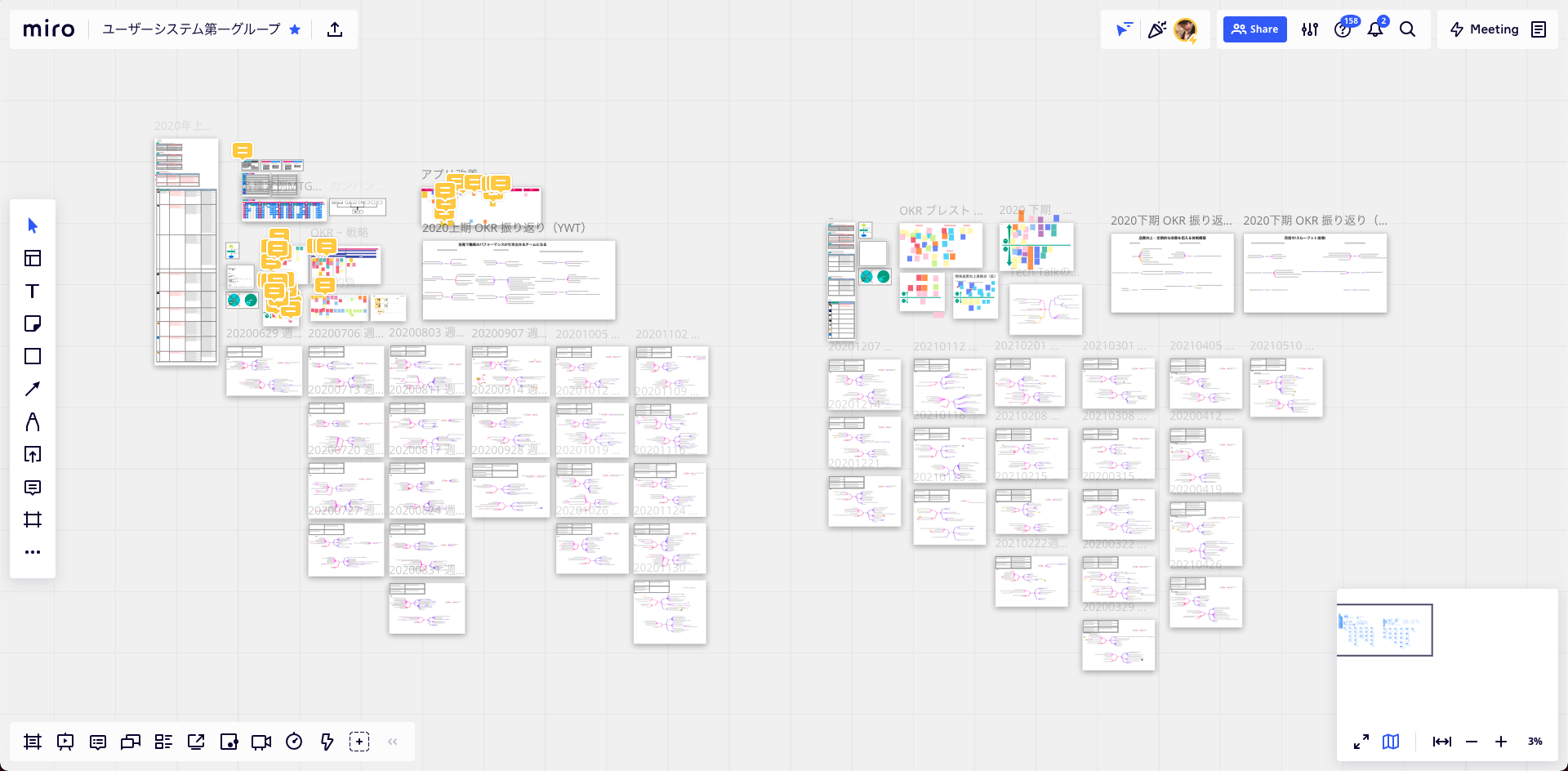 私たちは、Miroというオンラインホワイトボードツールで、目標設定の内容や、非定期で行なっているブレストの内容、各週の振り返りなどを一箇所に集めることにしました。